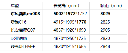 家庭出游的核心訴求是“全員舒適”,空間表現(xiàn)直接影響乘坐體驗(yàn)。在這一點(diǎn)上,東風(fēng)奕派eπ008交出了亮眼答卷,超5米的車長(zhǎng)(5002mm)與超3米的軸距(3025mm)全面碾壓同級(jí)競(jìng)品。五款車型中,東風(fēng)奕派eπ008是唯一一款車長(zhǎng)超過(guò)5米、軸距超過(guò)3米的車型。更高級(jí)別的車長(zhǎng)和軸距,帶來(lái)了更充裕的縱向空間,確保每位乘客皆可舒展身姿,盡享愜意旅途。