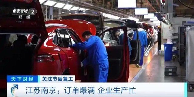 在南京市江北新區(qū)的一家大型汽車生產(chǎn)企業(yè),其中一個車間面積4萬平方米,產(chǎn)線從腳下延伸到了頭頂,工作人員正在緊張忙碌著,一輛輛嶄新的汽車高效地走向流水線。這里每天可以生產(chǎn)汽車1000輛左右。一些剛剛上市的新款新能源汽車產(chǎn)品,銷售非?;鸨唵我呀?jīng)排到了今年下半年。正月初五這里已經(jīng)全員在崗趕訂單。這個車間,每天兩個班組,1200多名工人日夜在崗,這個數(shù)字是去年春節(jié)同期的2.5倍。