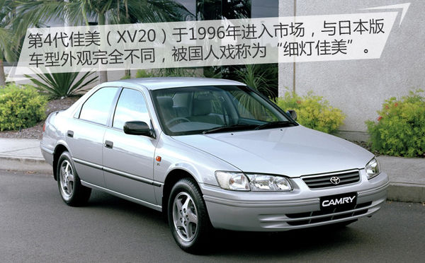 第4代佳美(XV20)于1996年進(jìn)入市場(chǎng),進(jìn)入國(guó)內(nèi)的仍是佳美海外版車型,在設(shè)計(jì)上與日本本土版采用了完全不同的理念。讓整車看上去更加修長(zhǎng)流暢,車頭和車尾都被設(shè)計(jì)得趨于扁平,由此帶來(lái)的是更細(xì)長(zhǎng)的頭燈和尾燈,所以XV20在國(guó)內(nèi)被人們戲稱為“細(xì)燈佳美”。