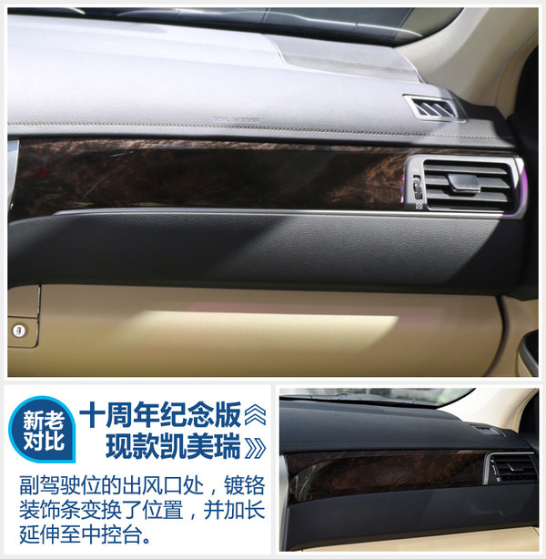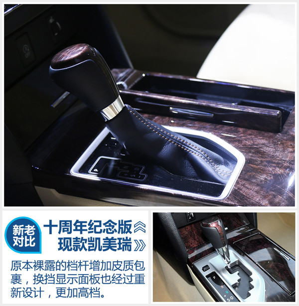 凱美瑞的“蛇形”換擋機(jī)制一直是筆者非常喜歡的設(shè)計(jì),最起碼在開車的時(shí)候不會(huì)因?yàn)閾Q錯(cuò)擋而發(fā)生意外碰撞。但是說(shuō)實(shí)話,裸露的檔桿總覺(jué)得缺了點(diǎn)什么。十周年紀(jì)念版將檔桿周圍加上了皮質(zhì)包裹,立馬將中控臺(tái)的“氣質(zhì)”提升了一個(gè)檔次,筆者本人是非常喜歡的。另外,副駕駛面前的木紋面板也增加了一條鍍鉻裝飾。