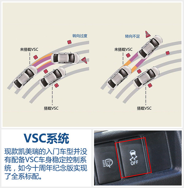 目前在售的現(xiàn)款凱美瑞入門版車型,并沒(méi)有配備VSC車型穩(wěn)定控制系統(tǒng),這對(duì)于預(yù)算有限的消費(fèi)者來(lái)說(shuō),原本可以成為購(gòu)買目標(biāo)的凱美瑞,很有可能就因?yàn)檫@一個(gè)配置被篩掉了。如今,十周年紀(jì)念版實(shí)現(xiàn)了全系車型標(biāo)配VSC系統(tǒng)。