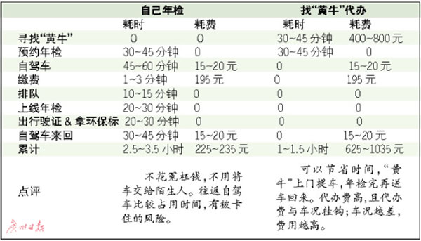 “老車(chē)”上線(xiàn)年檢,自己辦與找“黃?!贝k,各自需要占用多少時(shí)間和多少支出?給“黃?!钡脑┩麇X(qián),可不可以省下?