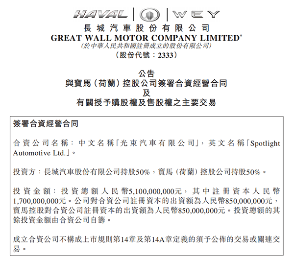 7月10日,長城、寶馬正式簽署合資經營合同。兩家公司聯(lián)合出資51億元人民幣,成立注冊資本為17億元的光束汽車有限公司,注冊地為江蘇省張家港市。