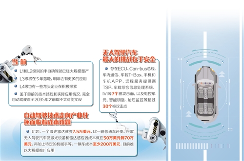 圖為東風(fēng)與華為共同研發(fā)的首款集成LTE-V/5G的無(wú)人駕駛汽車Sharing-VAN。該車不僅可以用于載客,還可應(yīng)用在智慧物流、移動(dòng)零售等場(chǎng)景。本報(bào)記者 楊忠陽(yáng)攝 當(dāng)前,L1和L2級(jí)別半自動(dòng)駕駛已經(jīng)大規(guī)模量產(chǎn);L3級(jí)將在今年落地,明年會(huì)有更多應(yīng)用;L4級(jí)也有一些龍頭企業(yè)在積極探索。但是,針對(duì)“2030年左右就可實(shí)現(xiàn)無(wú)人駕駛產(chǎn)業(yè)化”的預(yù)測(cè),專家則持謹(jǐn)慎態(tài)度。要真正實(shí)現(xiàn)完全意義上的無(wú)人駕駛,還面臨著安全、成本等一系列難題,需要產(chǎn)業(yè)界和全社會(huì)合力推動(dòng)解決。 沒(méi)有方向盤,沒(méi)有油門和剎車,內(nèi)部形同客廳,車內(nèi)感應(yīng)器會(huì)分析周圍情況,并巧妙地穿過(guò)步行者和停放的汽車,有序前進(jìn)……4月2日,一輛無(wú)人駕駛汽車在湖北襄陽(yáng)新落成的國(guó)家智能網(wǎng)聯(lián)汽車產(chǎn)品質(zhì)量監(jiān)督檢驗(yàn)中心吸引了不少參加“智行隆中”活動(dòng)的嘉賓試乘體驗(yàn),引起眾人嘖嘖稱贊。 東風(fēng)汽車集團(tuán)有限公司副總經(jīng)理尤崢介紹,這是東風(fēng)與華為共同研發(fā)的首款集成LTE-V/5G無(wú)人駕駛汽車Sharing-VAN,該車不僅可以用于載客,還可應(yīng)用于智慧物流、移動(dòng)零售等場(chǎng)景。近年來(lái),隨著新一代信息技術(shù)與汽車產(chǎn)業(yè)加速融合,國(guó)內(nèi)外企業(yè)紛紛加快無(wú)人駕駛汽車研發(fā)與測(cè)試。無(wú)人駕駛汽車也再次成為熱議話題,它究竟離我們還有多遠(yuǎn)? “沒(méi)有想象得那么快” 清華大學(xué)蘇州汽車研究院院長(zhǎng)成波說(shuō),智能網(wǎng)聯(lián)汽車是指搭載先進(jìn)的車載傳感器、控制器、執(zhí)行器等裝置,融合現(xiàn)代通信與網(wǎng)絡(luò)技術(shù),實(shí)現(xiàn)車(V)與人、車、路、云等(X)智能信息交換和共享,使車輛具備復(fù)雜環(huán)境感知、智能化決策、協(xié)同控制功能,能實(shí)現(xiàn)安全、節(jié)能、環(huán)保、舒適行駛,逐步替代人操作的新一代汽車。 據(jù)介紹,國(guó)際汽車工程師學(xué)會(huì)構(gòu)建了自動(dòng)駕駛的六級(jí)分類標(biāo)準(zhǔn):L0指人工駕駛;L1至L4的駕駛過(guò)程均由駕駛員與系統(tǒng)合作,或由系統(tǒng)部分完成;L5則是指完全自動(dòng)駕駛,即無(wú)人駕駛。 不過(guò),針對(duì)“2030年左右就可實(shí)現(xiàn)無(wú)人駕駛產(chǎn)業(yè)化”的預(yù)測(cè),成波則持謹(jǐn)慎態(tài)度?!盁o(wú)人駕駛是自動(dòng)駕駛的最高境界,半自動(dòng)化不等于真正的無(wú)人駕駛。”成波說(shuō),部分替代人或在局部區(qū)域替代人駕駛,樂(lè)觀一點(diǎn)到2025年就可以實(shí)現(xiàn)。比如,自動(dòng)泊車等功能不難做到。 “當(dāng)前,L1和L2級(jí)別的半自動(dòng)駕駛已經(jīng)大規(guī)模量產(chǎn);L3級(jí)將在今年落地,明年會(huì)有更多應(yīng)用;L4級(jí)也有一些龍頭企業(yè)在積極探索?!背刹ㄅe例說(shuō),去年奧迪推出了世界第一臺(tái)量產(chǎn)的L3級(jí)自動(dòng)駕駛汽車奧迪A8;韓國(guó)起亞發(fā)布了L4級(jí)智能駕駛概念車NiroEV;日產(chǎn)發(fā)布的“量產(chǎn)版”IMX概念車也宣稱搭載了L4級(jí)智能駕駛?!暗?,距離真正實(shí)現(xiàn)L5級(jí)無(wú)人駕駛,恐怕并沒(méi)有大家想象得那么快?!?/p> 英國(guó)汽車制造商和貿(mào)易商協(xié)會(huì)也指出,鑒于目前的技術(shù)路線和實(shí)際應(yīng)用情況,完全自動(dòng)駕駛直至2035年之前都不太可能實(shí)現(xiàn)。 安全仍是最大問(wèn)題 “無(wú)人駕駛汽車能不能實(shí)現(xiàn),最大的挑戰(zhàn)在于安全?!背刹ㄕf(shuō),隨著信息技術(shù)與汽車技術(shù)的融合,汽車安全已從被動(dòng)安全升級(jí)到主動(dòng)安全,從碰撞安全升級(jí)到行駛安全、功能安全和信息安全。 目前,無(wú)人駕駛汽車基本上不設(shè)防,存在ECU、Can-bus總線、車內(nèi)通信、車載T-Box、手機(jī)和車機(jī)APP、遠(yuǎn)程服務(wù)提供商TSP、車載綜合信息處理系統(tǒng)、IVI等7個(gè)被攻擊面,以及電控單元、智能鑰匙、胎壓監(jiān)控等超過(guò)30個(gè)被攻擊點(diǎn),“在大面積聯(lián)網(wǎng)使用時(shí),汽車既可造福人類,也有可能帶來(lái)危險(xiǎn)?!背刹ㄕf(shuō)。 “如果沒(méi)有安全底線,就很難大規(guī)模產(chǎn)業(yè)化?!背刹ㄕJ(rèn)為,人工智能雖然可以感知、理解、識(shí)別復(fù)雜的環(huán)境,但也很難做到萬(wàn)無(wú)一失,不可能完全避免交通事故。因此,還需要通過(guò)深度學(xué)習(xí)、用大數(shù)據(jù)反復(fù)訓(xùn)練。 近年來(lái),特斯拉自動(dòng)駕駛(L2)在全球發(fā)生多起致命事故。研究發(fā)現(xiàn),在路面放置干擾標(biāo)識(shí),可以輕而易舉地使自動(dòng)駕駛系統(tǒng)作出錯(cuò)誤判斷,甚至駛上逆行車道。對(duì)此,特斯拉回應(yīng)稱,駕駛員可隨時(shí)通過(guò)人工操作方向盤或剎車來(lái)糾正。專家指出,這反映了目前自動(dòng)駕駛技術(shù)仍然不能將駕駛員的雙手從方向盤上“解放”。 此外,自動(dòng)駕駛技術(shù)走向產(chǎn)業(yè)化還面臨著成本難題。比如,一個(gè)激光雷達(dá)就要7.5萬(wàn)美元,比一輛普通車還貴。谷歌無(wú)人駕駛汽車