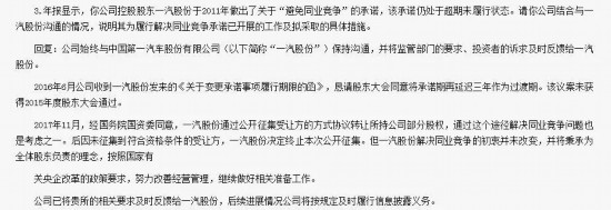 6月28日就要到了,雖然獲準(zhǔn)延遲三年,但解決一汽轎車與一汽夏利間同業(yè)競(jìng)爭(zhēng)問題的承諾終究還是到了該兌現(xiàn)的時(shí)候。 2011年6月,一汽股份成立之初,曾向一汽轎車和一汽夏利作出不可撤銷承諾:在一汽股份成立后五年內(nèi)通過資產(chǎn)重組或其他方式整合所屬的轎車整車生產(chǎn)業(yè)務(wù),以解決同業(yè)競(jìng)爭(zhēng)問題。但五年過去了,這一問題并未得到解決,在2016年6月28日,一汽轎車和一汽夏利同時(shí)發(fā)布公告稱,一汽股份原計(jì)劃在五年內(nèi)解決其與子公司一汽轎車、一汽夏利同業(yè)競(jìng)爭(zhēng)的承諾無法履行,將承諾期再度延遲三年作為過渡期,而上述承諾的截止日期,也就是2019年6月28日。