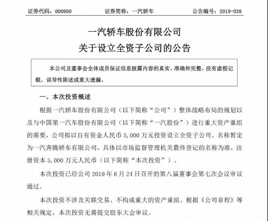 一汽轎車股份有限公司關(guān)于設(shè)立全資子公司的公告 6月25日,一汽轎車正式發(fā)布了《一汽轎車股份有限公司關(guān)于設(shè)立全資子公司的公告》,提出“擬以自有資金人民幣5000萬元投資設(shè)立全資子公司”,名稱暫定為“一汽奔騰轎車有限公司”。按照此前發(fā)布的《一汽轎車股份有限公司重大資產(chǎn)置換及發(fā)行股份和可轉(zhuǎn)換債券、支付現(xiàn)金購(gòu)買資產(chǎn)并募集配套資金暨關(guān)聯(lián)交易預(yù)案》,此次成立的“一汽奔騰轎車有限公司”在接受了一汽轎車的“置出資產(chǎn)”后,其100%股權(quán)將過戶至一汽股份。至此,一汽轎車的主營(yíng)業(yè)務(wù)將從“乘用車的開發(fā)、制造和銷售”徹底變更為“商用車的開發(fā)、制造和銷售”,與一汽夏利間的同業(yè)競(jìng)爭(zhēng)問題,即將徹底得到解決。 終于可以松口氣了! 從2011年6月至今,一汽夏利和一汽轎車長(zhǎng)達(dá)8年時(shí)間的“同業(yè)競(jìng)爭(zhēng)”困擾,算是暫時(shí)可以告一段落。盡管在一汽股份收下奔騰后,仍然存在一汽夏利和其控股股東一汽股份間的同業(yè)競(jìng)爭(zhēng)問題,但知名證券分析師、全聯(lián)車商投資管理(北京)有限公司總裁曹鶴在接受《中國(guó)汽車報(bào)》記者采訪時(shí)表示,畢竟一汽夏利和一汽股份間不像之前那樣,同為兩大上市公司,因此,解決這一問題的迫切性就沒有這么大了。至少,一汽夏利和一汽轎車不會(huì)再因?yàn)檫@個(gè)問題受到深交所的問詢。 事實(shí)上,6月4日,深交所在向天津一汽夏利汽車股份有限公司發(fā)出的年報(bào)問詢函中,除了虧損和股權(quán)交易等情況外,再次提及了同業(yè)競(jìng)爭(zhēng)問題,要求一汽夏利“結(jié)合與一汽股份溝通的情況,說明其為履行解決同業(yè)競(jìng)爭(zhēng)承諾已開展的工作及擬采取的具體措施”。對(duì)此,一汽夏利的回復(fù)如下。