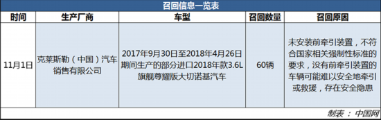 中國網(wǎng)汽車11月4日訊 近日,克萊斯勒(中國)汽車銷售有限公司根據(jù)《缺陷汽車產(chǎn)品召回管理?xiàng)l例》和《缺陷汽車產(chǎn)品召回管理?xiàng)l例實(shí)施辦法》的要求,向國家市場監(jiān)督管理總局備案了召回計(jì)劃。決定自11月1日起,召回2017年9月30日至2018年4月26日期間生產(chǎn)的部分進(jìn)口2018年款3.6L旗艦尊耀版大切諾基汽車,共計(jì)60輛。