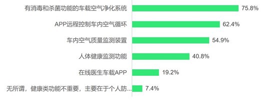 被調(diào)查的有車一族也希望在車內(nèi)增加空氣凈化和空氣質(zhì)量監(jiān)測(cè)裝置。除此以外,人體健康監(jiān)測(cè)功能和在線醫(yī)生等與健康相關(guān)的功能和配置也愈發(fā)受到車主重視。汽車廠商應(yīng)用具備車內(nèi)空氣健康、安全的汽車新品,滿足消費(fèi)者的需求。