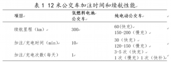以12米公交車實際運行的數(shù)據(jù)為例,加注/充電時間和續(xù)航性能對比如表1所示。