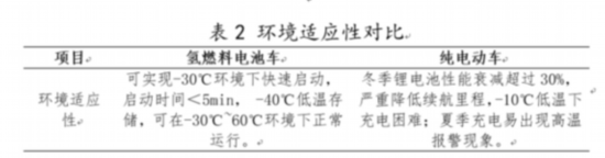 氫燃料電池車與純電動車的環(huán)境適應(yīng)性對比如表2所示。