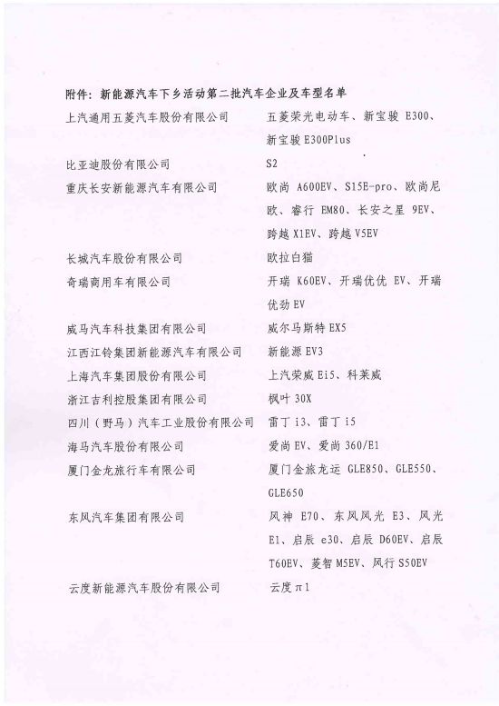 以下為本批新能源汽車下鄉(xiāng)企業(yè)及車型名單: