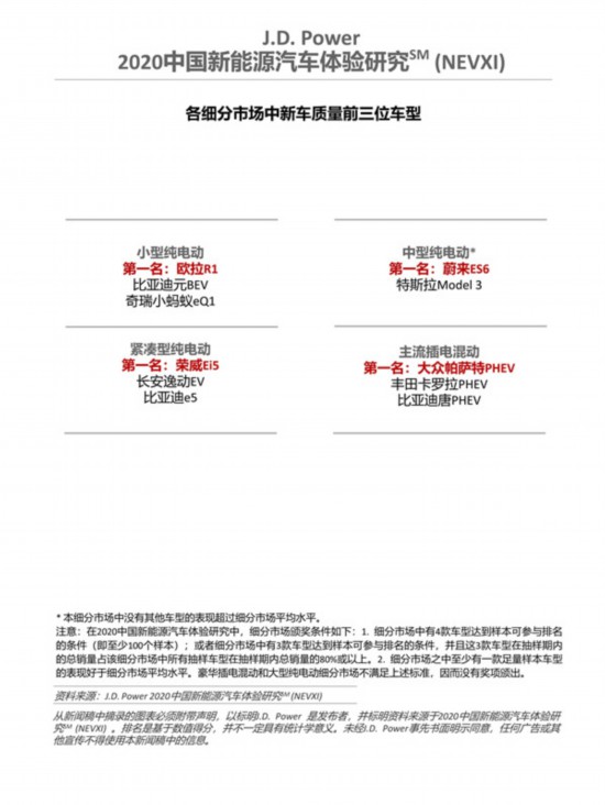 研究結(jié)果顯示,上汽大眾(105 個(gè) PP100)獲得插電混動(dòng)車(chē)市場(chǎng)新車(chē)質(zhì)量第一名,寶馬(108個(gè)PP100)位列插電混動(dòng)車(chē)市場(chǎng)第二位。蔚來(lái)(109 個(gè) PP100)獲得純電動(dòng)車(chē)市場(chǎng)新車(chē)質(zhì)量第一名,特斯拉(113個(gè)PP100)和歐拉(129個(gè)PP100)位列純電動(dòng)車(chē)市場(chǎng)第二和第三位;車(chē)型層面,歐拉R1榮獲小型純電動(dòng)細(xì)分市場(chǎng)第一;榮威Ei5榮獲緊湊型純電動(dòng)細(xì)分市場(chǎng)第一;蔚來(lái)ES6摘得中型純電動(dòng)細(xì)分市場(chǎng)第一;大眾帕薩特 PHEV 摘得主流插電混動(dòng)細(xì)分市場(chǎng)第一;豪華插電混動(dòng)和大型純電動(dòng)細(xì)分市場(chǎng)因?yàn)椴粷M足細(xì)分市場(chǎng)頒獎(jiǎng)條件,因而沒(méi)有獎(jiǎng)項(xiàng)頒出。