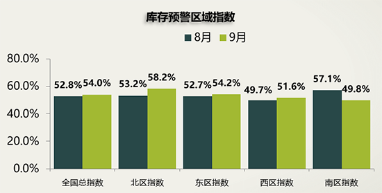 從區(qū)域情況來看,北區(qū)指數(shù)為58.2%,東區(qū)指數(shù)為54.2%,西區(qū)指數(shù)為51.6%,南區(qū)指數(shù)為49.8%,是唯一位于警戒線以下的區(qū)域。樊宇表示,臨近四季度,經銷商進入秋季補庫周期,而南方地區(qū)的廣東、湖南、湖北等省份銷量增速較快,庫存壓力略有緩和。