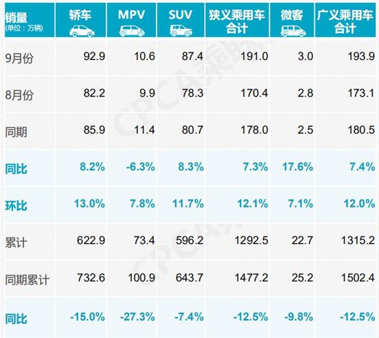 9月,國內(nèi)狹義乘用車銷量達到191.0萬輛,同比增長7.3%,三季度較去年同期實現(xiàn)約38萬輛的銷售增量;1-9月累計銷量增速下滑也收窄至12.5%,較1-8月再提升2.7個百分點。國內(nèi)乘用車市場繼續(xù)呈現(xiàn)較強的回暖趨勢。