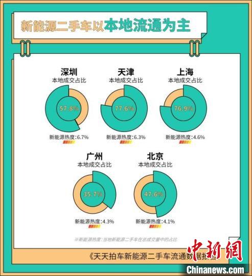 不過,在新能源二手車流通方面,本地化、區(qū)域化的交易目前仍是主要的流通方式。深圳的本地成交占比為57.8%、天津為77.6%、上海為76.9%,從整體來看,本地成交的新能源二手車在天天拍車平臺的占比為63%,大部分的新能源二手車被本地買家買走。