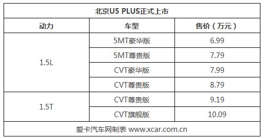 9月23日,北京U5 PLUS正式上市,售價(jià)區(qū)間為6.99-10.09萬(wàn)元。北京U5 PLUS是北京U5的中期改款車型,新車在名字后面加了一個(gè)PLUS后綴。北京U5 PLUS配備了最新的北京汽車LOGO,外觀設(shè)計(jì)更加年輕化、內(nèi)飾科技感更足。詳細(xì)售價(jià)請(qǐng)見(jiàn)下表: