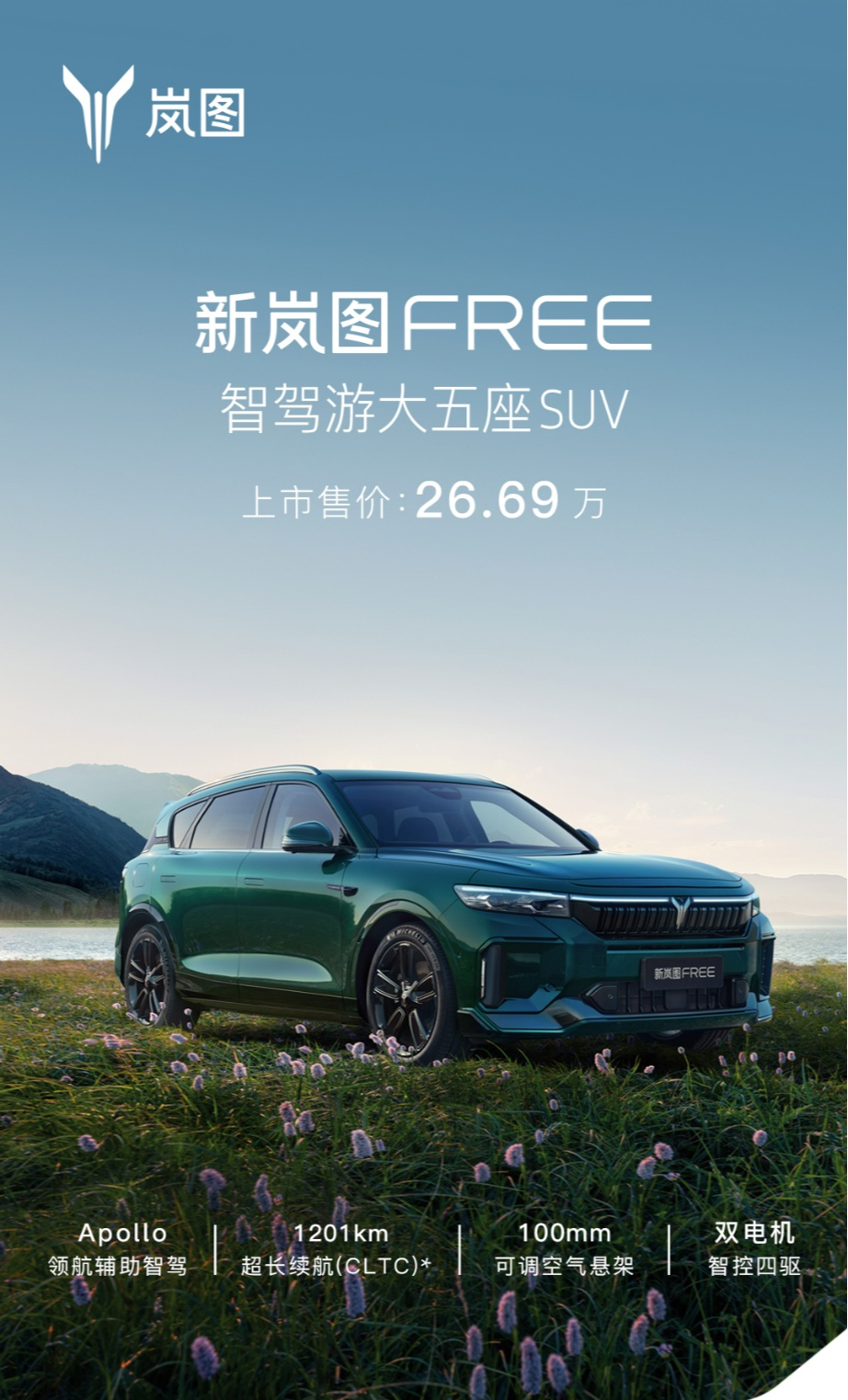 嵐圖汽車CEO盧放表示,作為“智駕游大五座SUV”,新嵐圖FREE的“智”,代表Apollo Highway Driving Pro領(lǐng)航輔助智駕帶來的智駕體驗;“駕”,意味著繼承了嵐圖品牌基因里的駕控實力;“游”,則是超長續(xù)航、超低能耗以及豪華配置帶來的舒適享受。新嵐圖FREE有智慧、有力量、有激情,專為追求自由的“公路旅行家”打造,嵐圖期待與廣大用戶一起,盡情釋放心中的自由,奔赴遠(yuǎn)方,開啟人生的“智駕游”。