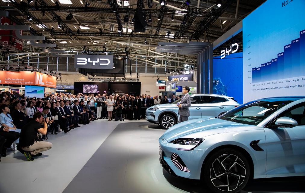 這是9月4日在德國慕尼黑國際車展媒體預(yù)展上拍攝的比亞迪發(fā)布會現(xiàn)場。新華社記者張帆攝