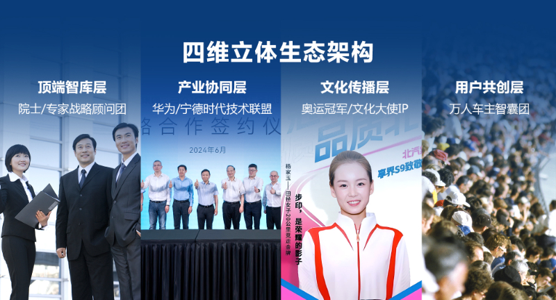 “品牌摯友計(jì)劃”是北汽集團(tuán)“品牌三年躍升行動(dòng)”的重要引擎,構(gòu)建一個(gè)“四維立體生態(tài)”:頂端智庫層,邀請?jiān)菏俊<?、?jīng)濟(jì)學(xué)家組成戰(zhàn)略顧問團(tuán);產(chǎn)業(yè)協(xié)同層,與華為、寧德時(shí)代等合作伙伴共建技術(shù)品牌聯(lián)盟;文化傳播層,攜手奧運(yùn)冠軍、文化名人打造"美好出行大使"IP;用戶共創(chuàng)層,建立萬人級車主智囊團(tuán)。除了外部資源,品牌摯友計(jì)劃還將逐步拓展至20位內(nèi)部管理者及300名KOE員工。