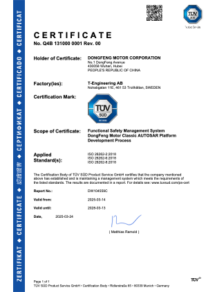 東風(fēng)汽車自主AUTOSAR平臺(tái)獲得ISO 26262 ASIL-D級(jí)流程認(rèn)證證書,充分證明了該平臺(tái)在功能安全流程管理、風(fēng)險(xiǎn)分析、開(kāi)發(fā)驗(yàn)證等方面均滿足最高安全等級(jí)要求,能夠有效支撐智能駕駛、新能源汽車等場(chǎng)景下對(duì)高安全性的需求,進(jìn)一步彰顯了東風(fēng)汽車在功能安全領(lǐng)域的技術(shù)底蘊(yùn)。