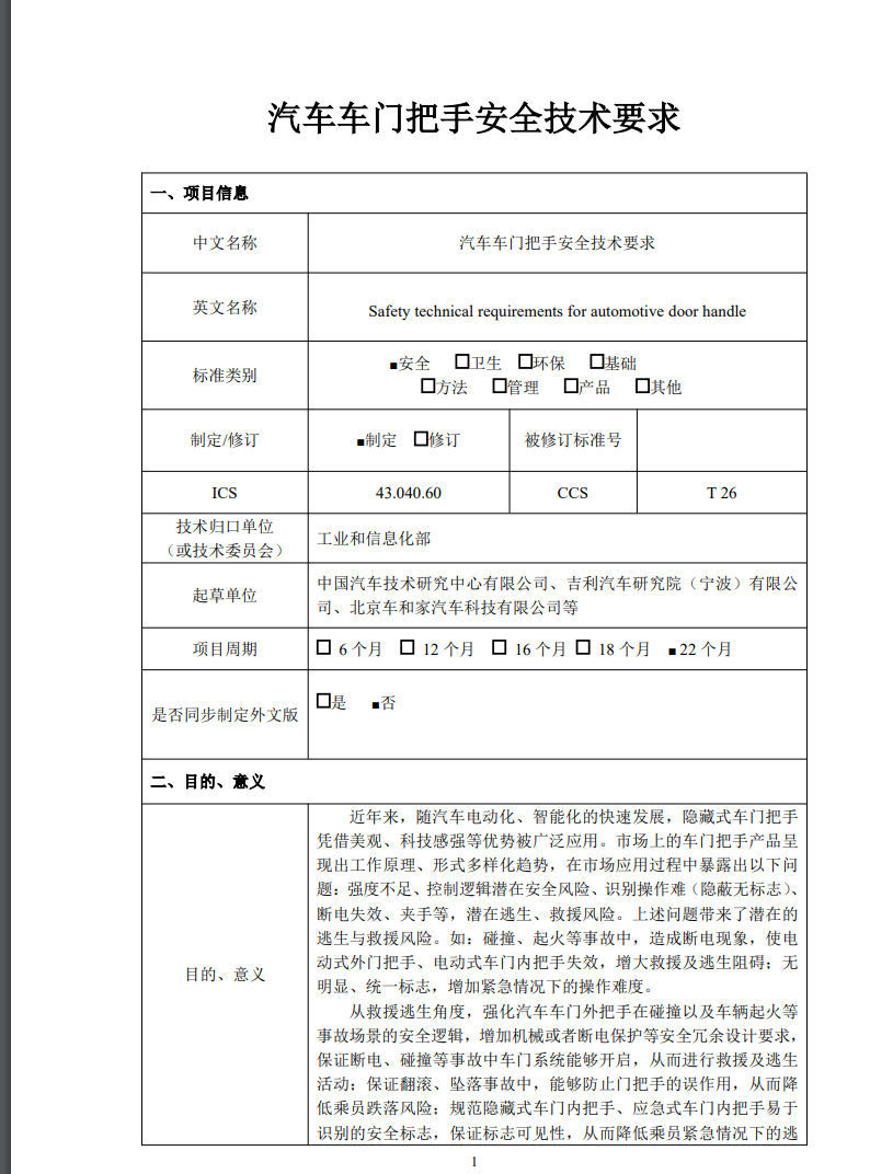 該文件中稱,近年來,隨汽車電動(dòng)化、智能化的快速發(fā)展,隱藏式車門把手憑借美觀、科技感強(qiáng)等優(yōu)勢被廣泛應(yīng)用。市場上的車門把手產(chǎn)品呈現(xiàn)出工作原理、形式多樣化趨勢,在市場應(yīng)用過程中暴露出以下問題:強(qiáng)度不足、控制邏輯潛在安全風(fēng)險(xiǎn)、識(shí)別操作難(隱蔽無標(biāo)志)、斷電失效、夾手等,潛在逃生、救援風(fēng)險(xiǎn)。上述問題帶來了潛在的逃生與救援風(fēng)險(xiǎn)。如:碰撞、起火等事故中,造成斷電現(xiàn)象,使電動(dòng)式外門把手、電動(dòng)式車門內(nèi)把手失效,增大救援及逃生阻礙;無明顯、統(tǒng)一標(biāo)志,增加緊急情況下的操作難度。