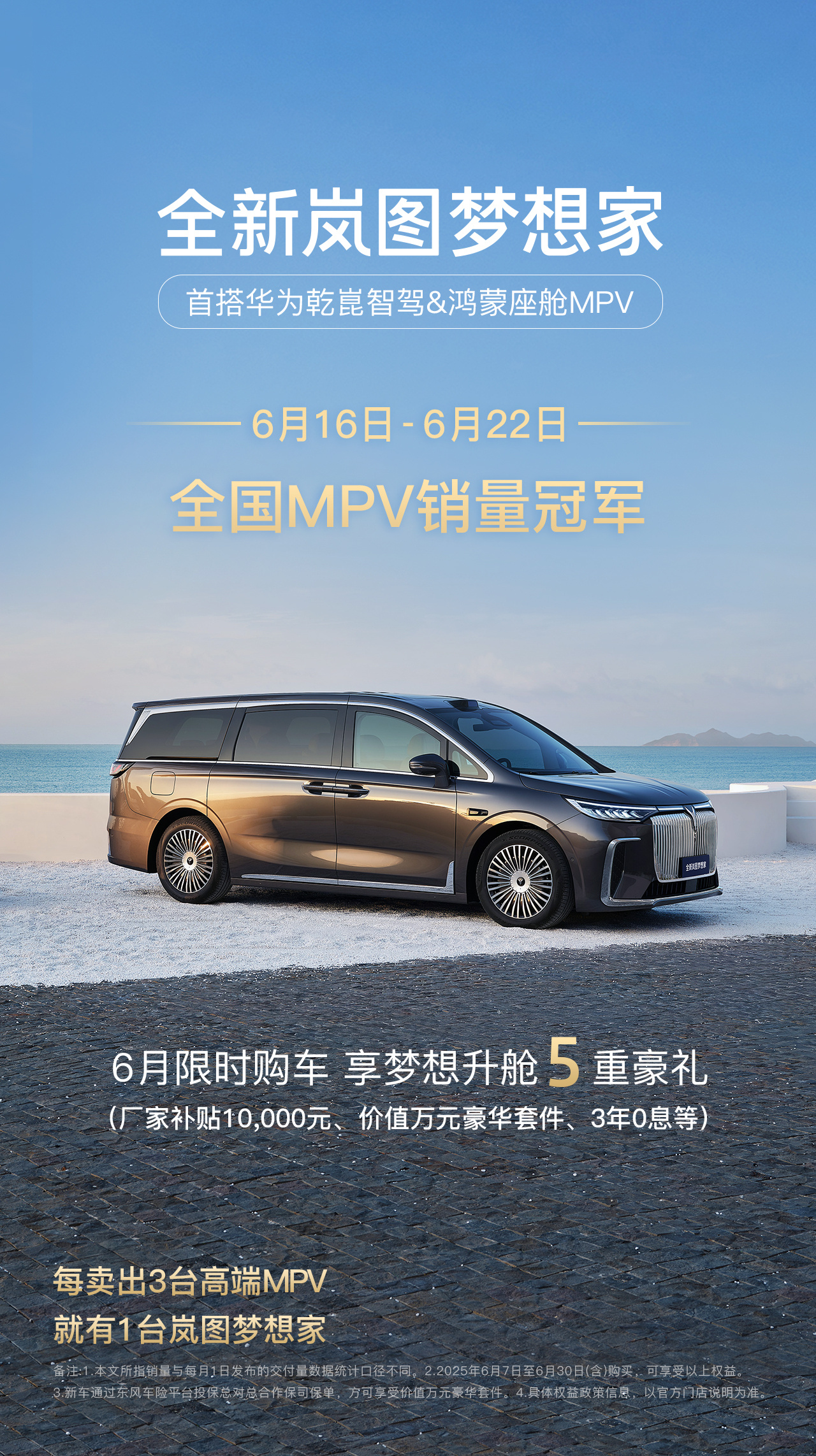 央廣網(wǎng)北京6月24日消息(記者姜鵬)6月24日,6月第三周(6月16日-22日)MPV周銷量榜單揭曉!嵐圖夢想家憑借強大的產(chǎn)品力,以單周2720輛再奪MPV銷量冠軍,不僅超越騰勢D9、高山等新能源對手,更超越GL8、賽那等傳統(tǒng)燃油MPV,持續(xù)鞏固細分市場標桿地位。