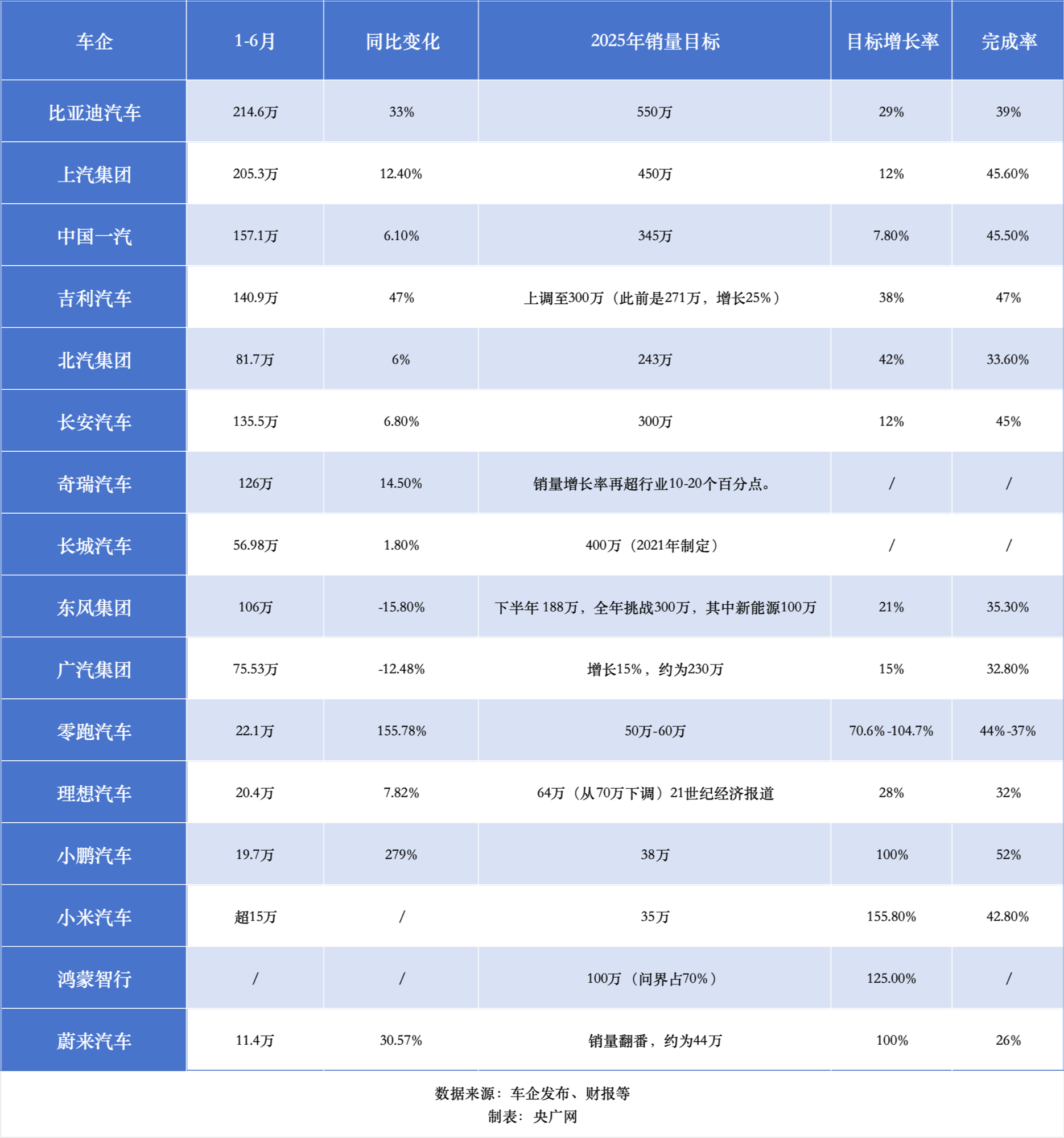 央廣網(wǎng)統(tǒng)計(jì)的各大汽車集團(tuán)、車企公布的銷量數(shù)據(jù),目前,蔚來汽車的目標(biāo)完成率低于30%,比亞迪汽車、北汽集團(tuán)、東風(fēng)集團(tuán)、廣汽集團(tuán)、理想汽車5家車企的目標(biāo)完成率在30%-40%之間,上汽集團(tuán)、中國(guó)一汽、吉利集團(tuán)、長(zhǎng)安汽車、零跑汽車、小鵬汽車、小米汽車7家車企的完成率超過40%。此外,奇瑞集團(tuán)、長(zhǎng)城汽車、鴻蒙智行等因數(shù)據(jù)不完善此次不計(jì)入統(tǒng)計(jì)。