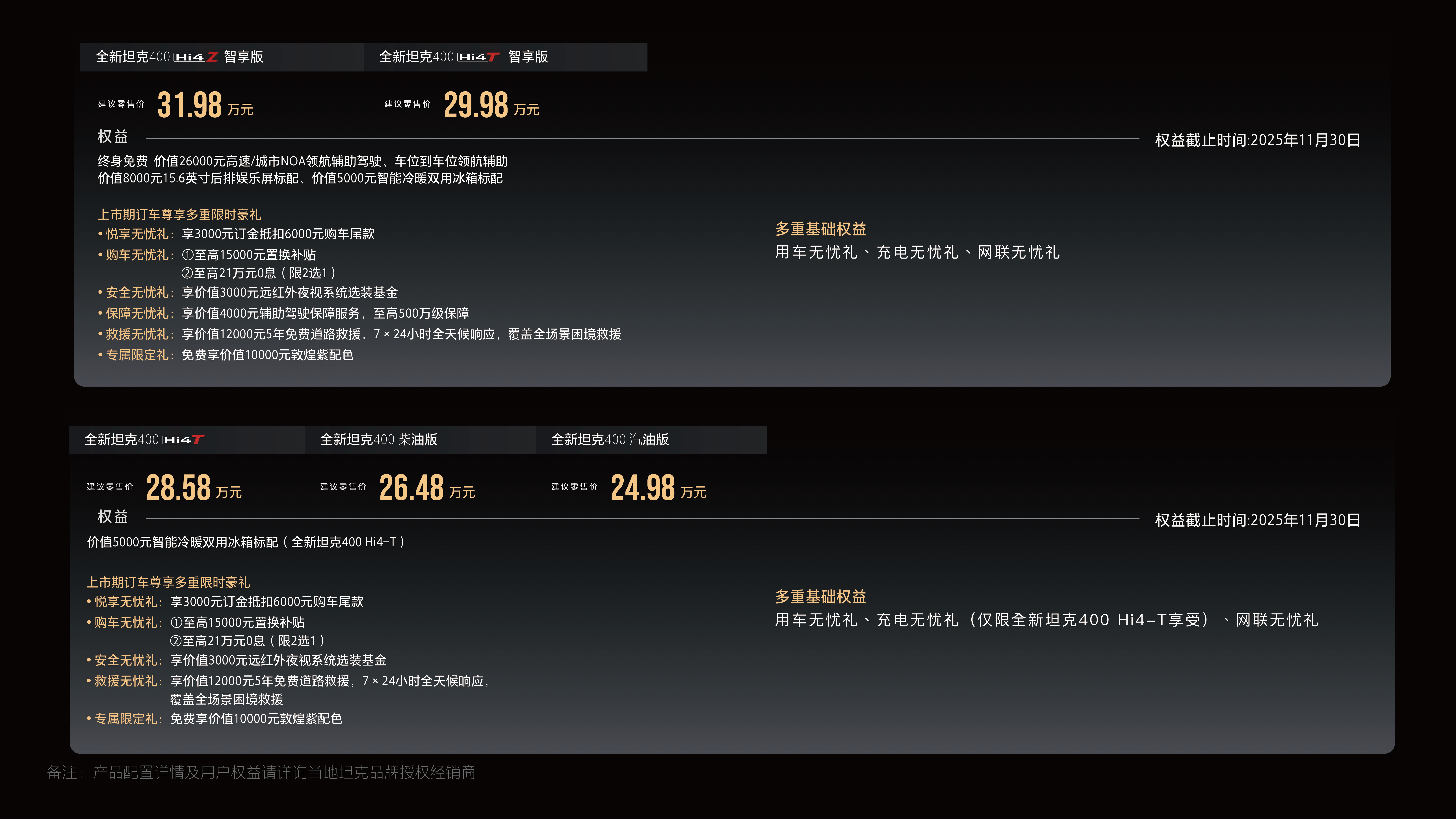 全新坦克400 Hi4-Z智享版,售價31.98萬元;全新坦克400 Hi4-T智享版,售價29.98萬元;全新坦克400 Hi4-T,售價28.58萬元;全新坦克400 柴油版,售價26.48萬元;全新坦克400 汽油版,售價24.98萬元。即刻下單可享多重尊崇權益,坦克以滿滿誠意為用戶帶來驚喜購車優(yōu)惠。