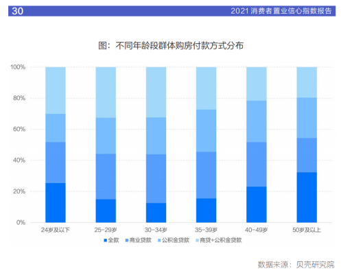 《報(bào)告》還顯示,消費(fèi)客群普遍通過加杠桿方式購房,受調(diào)群體中全款購房比例僅占 18.1%。對比不同年齡段群體看,25-39歲群體對杠桿的依賴度較高,貸款購房比例超過8成,其中30-34年齡段群體貸款比例最高,達(dá)87.4%。80前群體資金積累相較充足,對杠桿的依賴度相對較低,貸款比例未超過8成。95后父母多為60、70后,而這兩代人已經(jīng)有一定的財(cái)富積累,在購置房產(chǎn)時(shí),有能力對子女進(jìn)行資助,因此購房群體中全款購房比例相對較高。從購房群體的需求類型看,首次置業(yè)群體購房杠桿較高,貸款比例達(dá)86.6%。