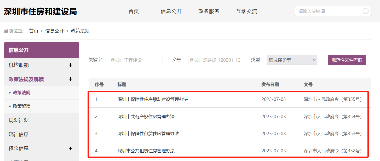 央廣網(wǎng)北京7月5日消息 據(jù)深圳市住房和建設(shè)局網(wǎng)站消息,7月3日,深圳市住建局發(fā)布《深圳市公共租賃住房管理辦法》《深圳市保障性租賃住房管理辦法》《深圳市共有產(chǎn)權(quán)住房管理辦法》《深圳市保障性住房規(guī)劃建設(shè)管理辦法》,具體來看,上述四項管理辦法,分別對公共租賃住房、共有產(chǎn)權(quán)住房、保障性租賃住房等三類住房的保障對象、申請條件、供應(yīng)分配方式、租售價格標(biāo)準、用地保障、建設(shè)籌集主體和渠道、建設(shè)標(biāo)準、監(jiān)督管理等進行了規(guī)范。四項管理辦法將于8月1日正式實施。