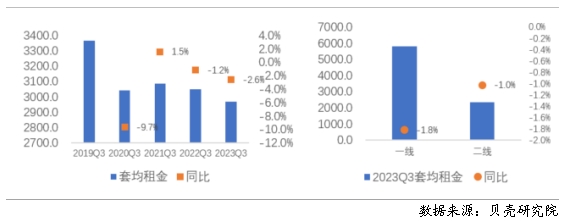 三季度,一線城市租金成交價(jià)同比跌幅高于二線城市,一線城市除北京微漲外,上海、廣州、深圳均同比下跌