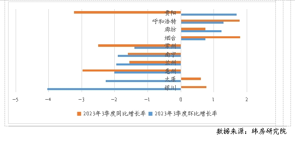 住房大數(shù)據(jù)監(jiān)測的重點(diǎn)40城中包括10個(gè)三線城市,其中4個(gè)城市三季度住房租金環(huán)比上漲,6個(gè)城市環(huán)比下降。其中,貴陽和呼和浩特環(huán)比漲幅最高,分別為1.69%和1.30%。與去年三季度末相比,5個(gè)城市住房租金低于去年同期水平,5個(gè)城市高于去年同期水平。其中,貴陽和惠州住房租金跌幅最高,分別為3.24%和2.98%;煙臺(tái)和呼和浩特漲幅最高,分別為1.8%和1.78%。