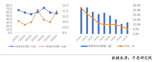 根據(jù)貝殼研究院數(shù)據(jù),全國重點(diǎn)40城三季度房客源成交周期分別為56.7、11.5天,房源成交周期環(huán)比減少2.1天,同比增加2.7天;客源成交周期環(huán)比延長1天,同比延長1天。隨著個(gè)人租賃房源供應(yīng)的增加,疊加保障性租賃住房、市場化集中式租賃房源的增加,個(gè)人業(yè)主出租房源出租速度減緩。從庫存房源來看,今年1-9月租賃庫存房源量均呈現(xiàn)同比增加的趨勢,與此同時(shí),租客租房面臨的選擇項(xiàng)增多,租客對于租賃房源可選類型和房源量均有增加。