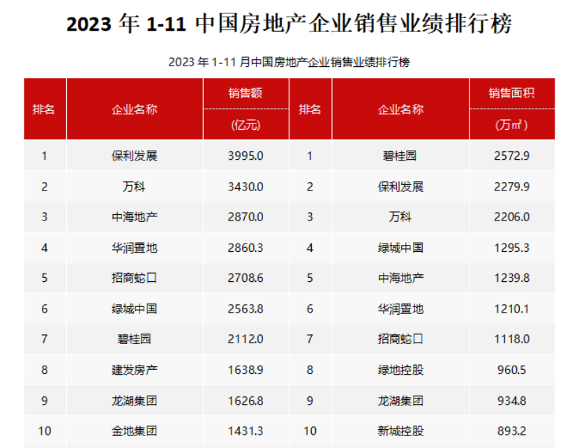 從企業(yè)表現來看,央國企銷售表現仍較為強勁。2023年1-11月,銷售額同比增長超過10%的大型企業(yè)為,中海、華潤、建發(fā)、越秀、華發(fā)、聯發(fā)、國貿地產、中建壹品、中建東孚、象嶼地產等,這些企業(yè)銷售增長較為強勁。