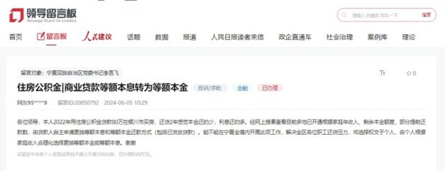 該網友上網查詢得知,目前多地已開通還款方式在等額本息與等額本金之間互轉的業(yè)務,借款人可自主申請更換等額本息和等額本金還款方式(包括已發(fā)放貸款),希望寧夏相關部門也可以開展此項工作,解決全區(qū)各位職工還貸壓力。