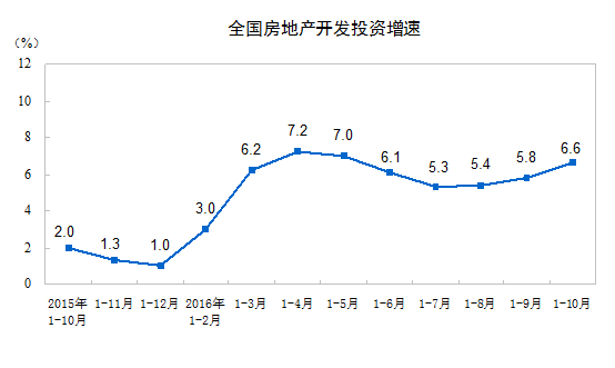 2016年1-10月份,全國房地產(chǎn)開發(fā)投資83975億元,同比名義增長6.6%,增速比1-9月份提高0.8個(gè)百分點(diǎn)。其中,住宅投資56294億元,增長5.9%,增速提高0.8個(gè)百分點(diǎn)。住宅投資占房地產(chǎn)開發(fā)投資的比重為67.0%。