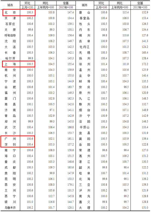 人民網(wǎng)北京10月20日電(記者孫紅麗)10月20日,國家統(tǒng)計局發(fā)布9月份商品住宅銷售價格變動情況統(tǒng)計數(shù)據(jù)。經(jīng)初步測算,4個一線城市新建商品住宅銷售價格環(huán)比上漲0.4%,漲幅比上月回落0.2個百分點。其中,北京、上海、廣州和深圳分別上漲0.3%、0.5%、0.6%和0.4%。