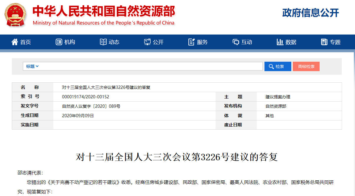您提出的《關(guān)于完善不動(dòng)產(chǎn)登記的若干建議》收悉。經(jīng)商住房城鄉(xiāng)建設(shè)部、民政部、國(guó)家保密局、最高人民法院、農(nóng)業(yè)農(nóng)村部、國(guó)家稅務(wù)總局共同研究,現(xiàn)答復(fù)如下: