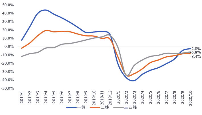 貝殼研究院統(tǒng)計整理數(shù)據(jù)顯示,截止2020年10月一線城市新房市場成交量恢復(fù)逐漸放緩,其中成交套數(shù)累計同比下滑2.8%、成交面積累計同比下滑1.8%;二線城市成交套數(shù)累計同比下滑8.4%、成交面積累計同比下滑9.5%;三四線城市成交套數(shù)累計同比下滑6.8%、成交面積累計同比下滑4.4%。整體環(huán)比9月基本持平。一線城市新房市場10月持續(xù)領(lǐng)跑全國,二線以下城市累計成交量同比下滑幅度持續(xù)穩(wěn)定,調(diào)控升級后,市場動力一般。