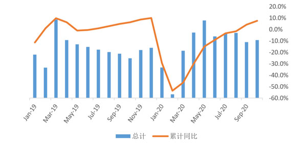2019年至今66座大中城市合計月度成交套數(shù)與成交面積累計同比 (數(shù)據(jù)來源:WIND,10月數(shù)據(jù)為全月預(yù)測值)