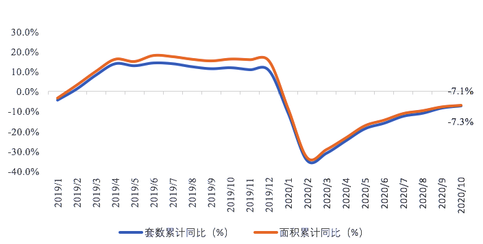 貝殼研究院統(tǒng)計整理數(shù)據(jù)顯示,2020年10月66城新房市場合計成交套數(shù)單月同比增長2.6%,環(huán)比下滑13.7%,成交面積單月同比下滑0.5%,環(huán)比下滑12.9%。由于自7月以來,深圳、南京、杭州、成都等多城市出臺調(diào)控升級政策,預(yù)防出現(xiàn)過熱現(xiàn)象,10月成交量環(huán)比明顯下滑。1-10月66城新房市場累計成交套數(shù)同比下滑7.1%,成交面積累計同比下滑7.1%,較9月累計降幅收窄不到1.0個百分點,市場恢復(fù)速度持續(xù)放緩。