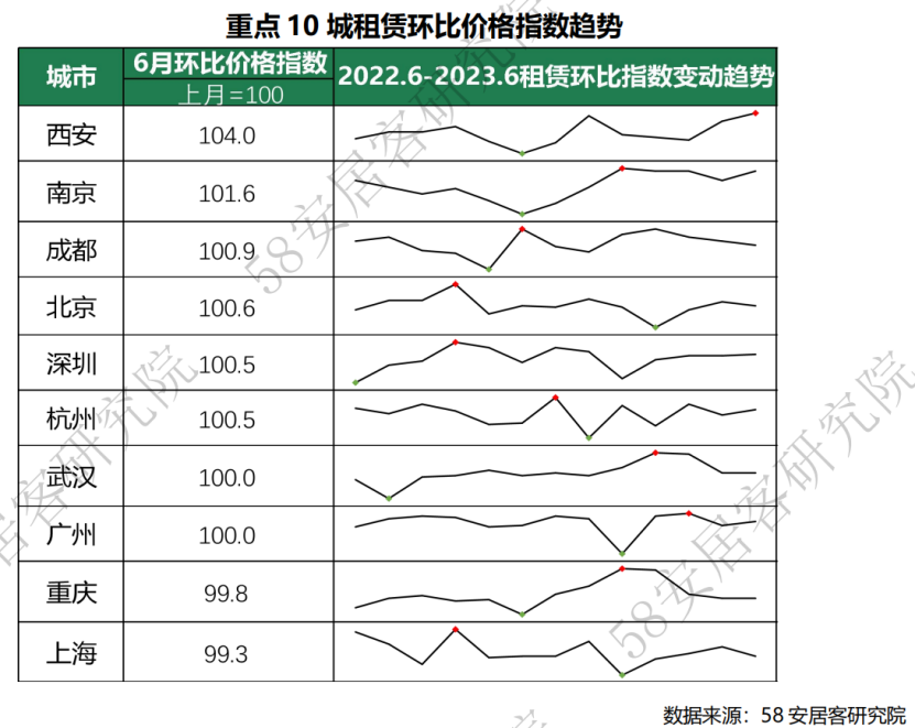 今年上半年,重點10城租賃市場整體呈現(xiàn)出平穩(wěn)復蘇的態(tài)勢。58同城、安居客《2023年上半年全國租賃市場報告》顯示,重點二線城市的價格表現(xiàn)強于一線城市,部分二線城市租賃價格指數(shù)保持了較好的回升趨勢,如成都、南京、武漢等城市上半年月度環(huán)比價格指數(shù)均呈現(xiàn)小幅溫和上升的趨勢。同時,步入5月夏季畢業(yè)季之后,租賃市場步入旺季,北京、深圳及西安連續(xù)兩個月的環(huán)比價格指數(shù)呈現(xiàn)回升。