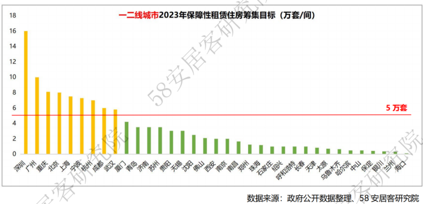 從“十四五”時期城市保障性租賃住房規(guī)劃目標來看,人口規(guī)模較大的一二線城市是保障性租賃住房的供應主力區(qū)域。58同城、安居客整理數(shù)據(jù)顯示,其中,一線城市在整體規(guī)劃規(guī)模中占比約26.5%,二線城市占比約57.4%。同時,二線城市之間的差異較大,強二線省會城市規(guī)劃規(guī)模在15萬套以上。今年,一二線城市保障性租賃住房籌集量占已公布城市籌集目標總量的75.2%,核心9城2023年保障性租賃住房籌集目標超過5萬套(間)。深圳、廣州今年的籌集目標較高,達到10萬套(間)以上。