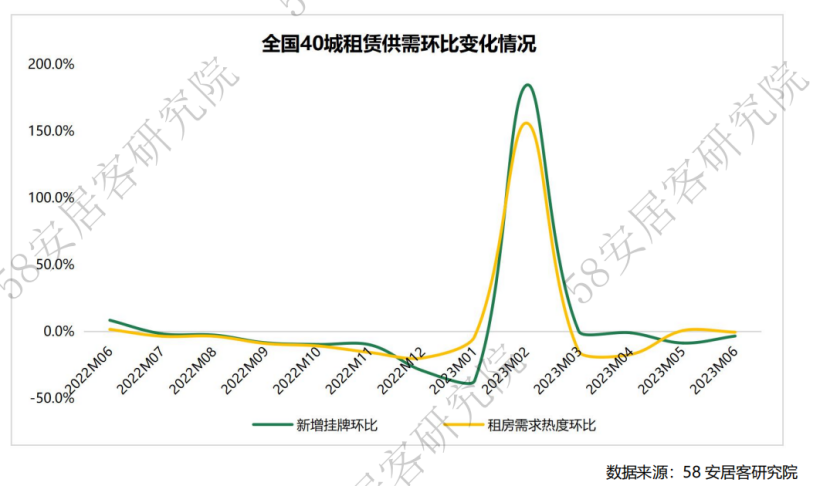 今年上半年,全國40城租賃市場供需基本處于同向波動,整體供需表現(xiàn)強于去年下半年。58同城、安居客《2023年上半年全國租賃市場報告》顯示,2月在春節(jié)后復產(chǎn)復工熱的帶動下,租賃市場迎來供需兩旺的“小陽春”行情。步入二季度后,隨著市場供需在一季度的集中性釋放,租賃供需趨于回落。5月和6月,租賃市場步入傳統(tǒng)的夏季畢業(yè)求職旺季。