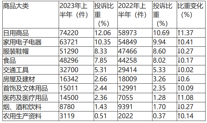 根據(jù)2023年上半年商品大類(lèi)投訴數(shù)據(jù),日用商品類(lèi)、家用電子電器類(lèi)、服裝鞋帽類(lèi)、食品類(lèi)和交通工具類(lèi)投訴量居前五位。與2022年上半年相比,日用商品類(lèi)、醫(yī)藥及醫(yī)療用品類(lèi)投訴比重上升明顯,房屋及建材類(lèi)投訴比重有所下降。