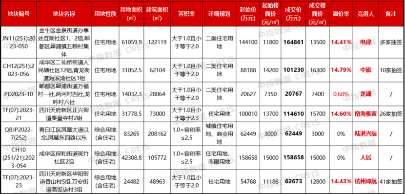 據(jù)中指研究院監(jiān)測,本次出讓的地塊主要位于核心主城區(qū),區(qū)位條件和地塊價(jià)值優(yōu)質(zhì),分別位于金牛、成華、天府新區(qū),新六區(qū)和郊區(qū)新城各1宗。從單宗地塊規(guī)??矗瑑H青白江鳳凰新城、金牛國賓、成華東客站分別出讓125畝、92畝、63畝;其余宗地皆小于50畝。除青白江宗地外,起拍樓面價(jià)區(qū)間為7350-15736元/㎡,土地最高限價(jià)區(qū)間為8400-17100元/㎡。