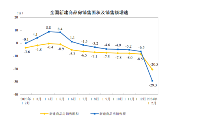 國家統(tǒng)計局?jǐn)?shù)據(jù)顯示,1-2月全國房地產(chǎn)開發(fā)投資累計同比繼續(xù)下降,但降幅相比于2023年全年有所收窄。