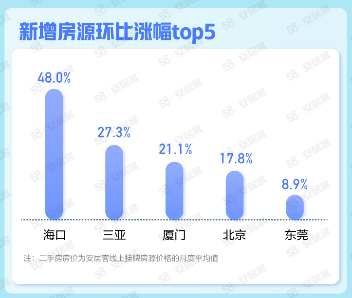 在新增供應(yīng)方面,10月全國65城新增掛牌房源量環(huán)比下跌4.1%。全國新增掛牌量房源環(huán)比上漲的前三名城市分別是???、三亞、廈門,分別上漲48%、27.3%、21.1%。