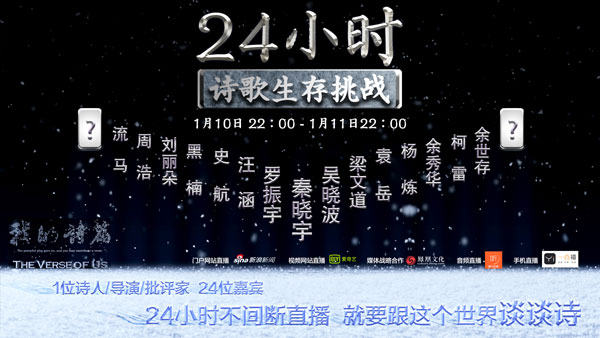 據(jù)了解,從1月10日晚22:00開始,秦導(dǎo)邀請(qǐng)了24位各界知名人士,24小時(shí)不間斷直播接力談詩歌。自媒體“羅輯思維”創(chuàng)始人羅振宇,著名財(cái)經(jīng)作家、財(cái)經(jīng)自媒體“吳曉波頻道”創(chuàng)始人吳曉波,國際著名詩人楊煉,香港著名文化人梁文道,湖南衛(wèi)視著名主持人汪涵,自媒體人袁岳,著名知識(shí)分子余世存,詩人余秀華,詩人、詩歌自媒體“讀首詩再睡覺”公號(hào)主編流馬,編劇史航,金馬獎(jiǎng)最佳紀(jì)錄片導(dǎo)演周浩,歐洲著名漢學(xué)家柯雷,著名音樂人黑楠等人,將通過現(xiàn)場、電話連線、視頻等多種方式參與本次在線直播活動(dòng),而鳳凰衛(wèi)視著名主持人曹景行、著名主持人崔永元以及詩歌評(píng)論家唐曉渡也有望一起參與。