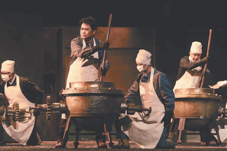 與歌劇跌宕的劇情相匹配,作曲家唐建平也創(chuàng)作了極具戲劇張力的音樂。全劇既有不少充滿挑戰(zhàn)的高音唱段,也有充滿“氛圍感”的旋律。221沒有合適的炸藥合成設(shè)備,工作人員就用人工土法攪拌,小危險(xiǎn)不時(shí)發(fā)生,這時(shí)的音樂充滿懸疑感,緊扣心弦。唐建平還在劇中融入了當(dāng)?shù)匾魳吩兀习雸?chǎng)音樂由藏族民歌引入,下半場(chǎng)則由青?;▋洪_啟,而在劇中的聯(lián)歡會(huì)上,藏族風(fēng)格的音樂元素不時(shí)響起,也為梁振道與女友的意外相遇鋪墊了情緒。